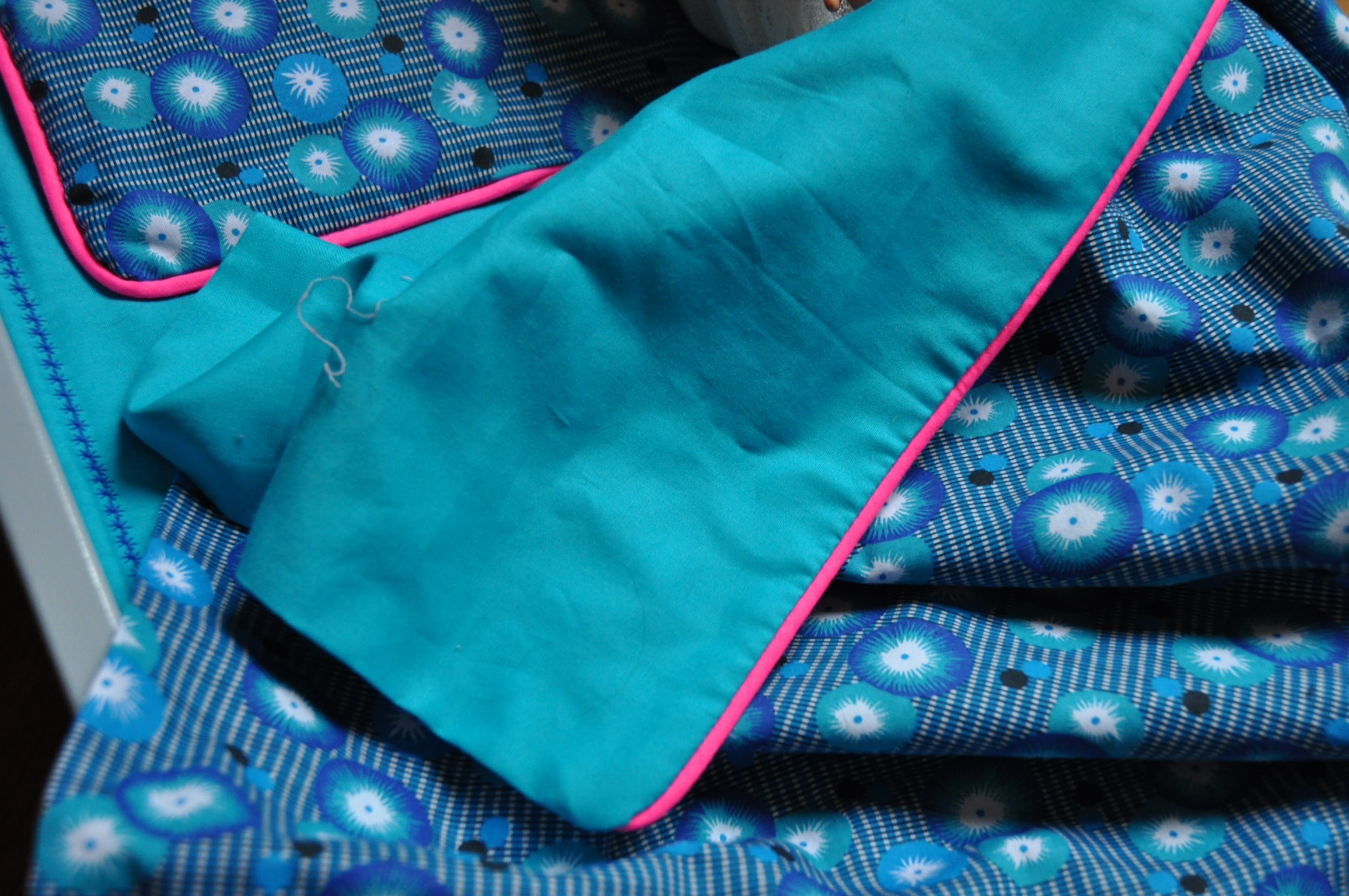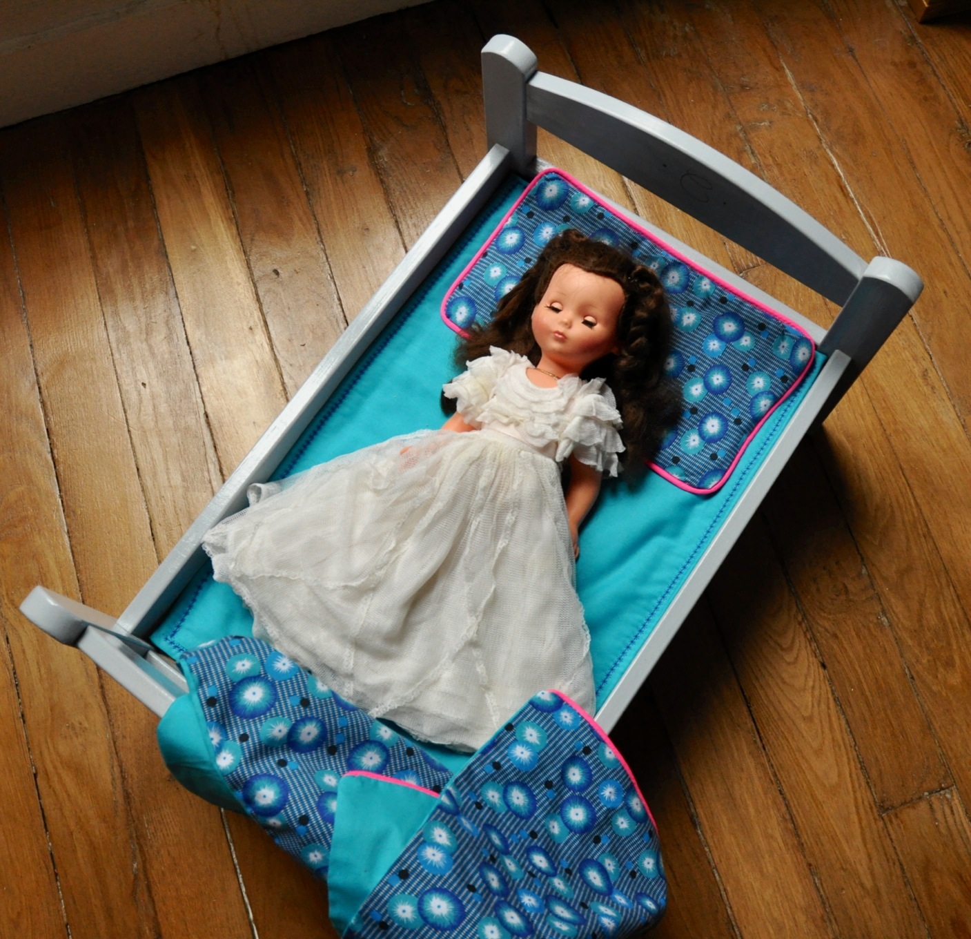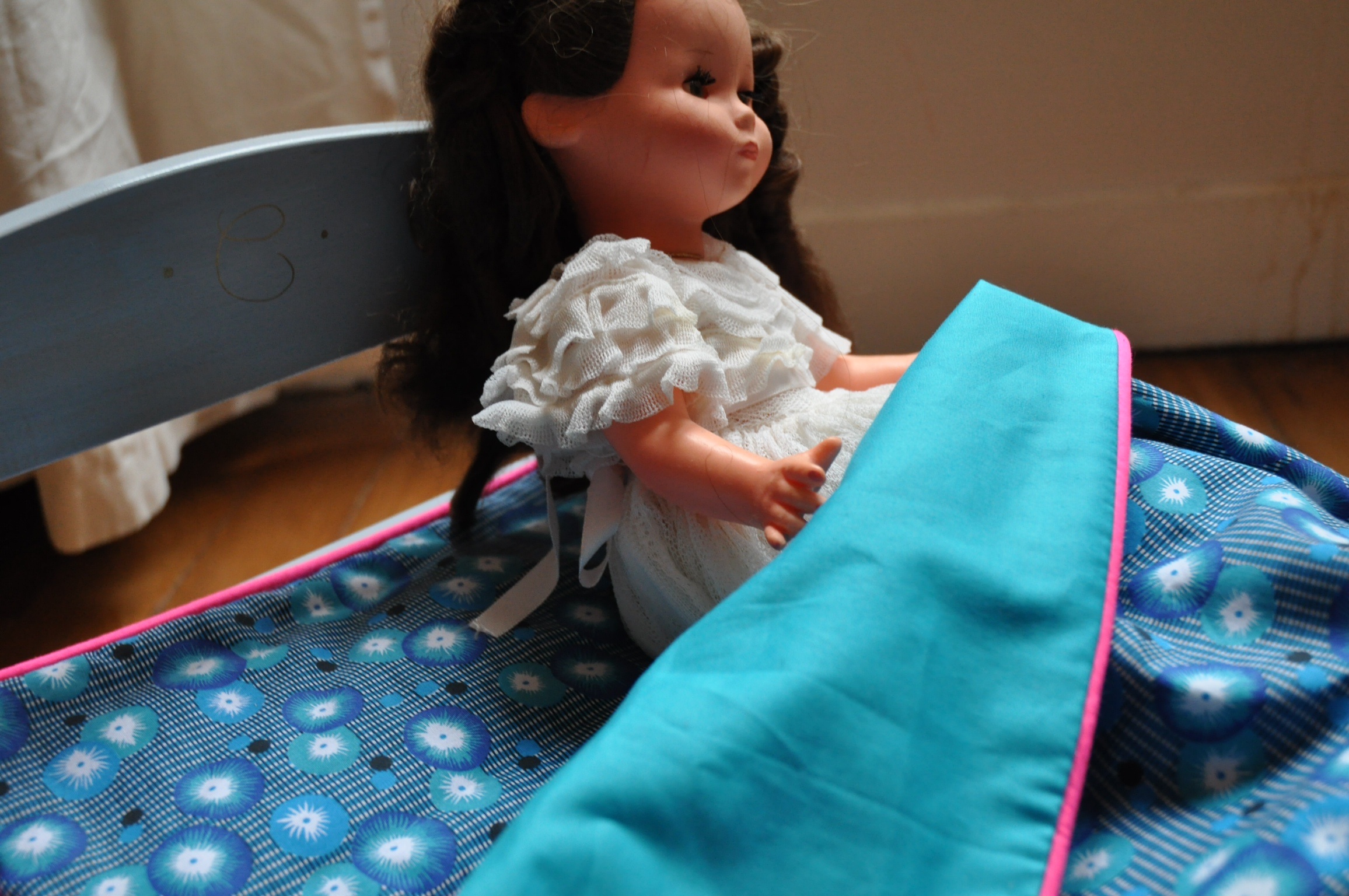 Pour contrer l’avalanche de cadeaux made in China pour les enfants (on a beau essayer d’en suggérer, ça ne marche pas toujours), je me suis amusée à coudre des petits draps pour un lit de poupée tout simple que j’ai repeint pour Chiara. Le petit matelas et l’oreiller sont recouverts de jolis tissus de chez Petit Pan et j’ai fait un drap double-face en utilisant les restes du passepoil. J’étais plutôt contente du résultat, mais surtout, surtout, de voir cette étincelle de joie dans ses yeux.