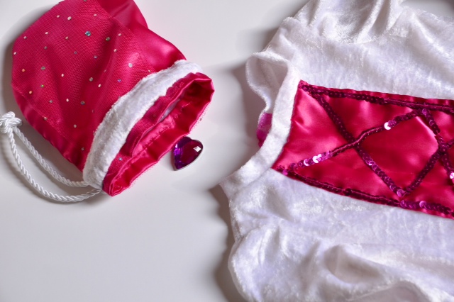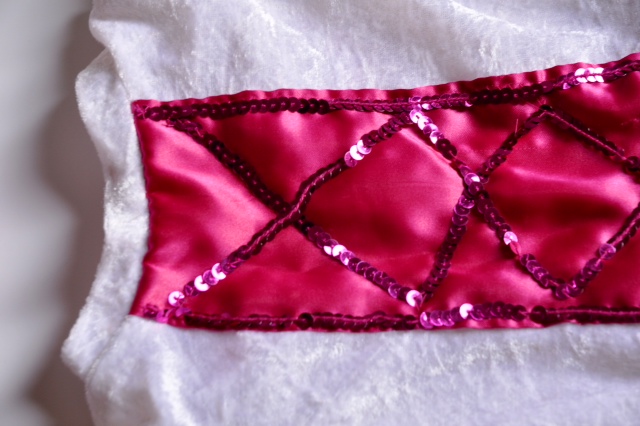 Donc, pour réaliser, cette fois-ci avec un peu de couture, un déguisement de jolie princesse pas-trop-parfait (et c’est pour ça qu’on va l’aimer), il vous faut:  du velours stretch, du satin et des paillettes à coudre ou des jolis rubans pour réaliser le petit haut