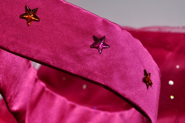 pour l’indispensable couronne: du plastique rigide recouvert de satin doublé et décoré avec des cabochons (à fixer avec un pistolet à colle)