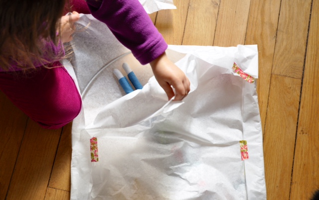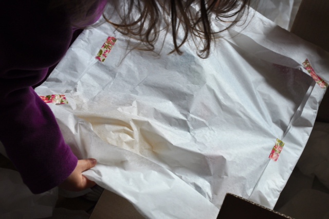 et là, surprise: tellement que ce paquet était beau, Chiara s’est mise à détacher les bouts de Scotch un par un, tout lentement, par peur d’abîmer le papier (tandis que je mourais d’impatience comme je n’avais qu’une idée vague de comment il allait être). Un premier bout est apparu…suspense…