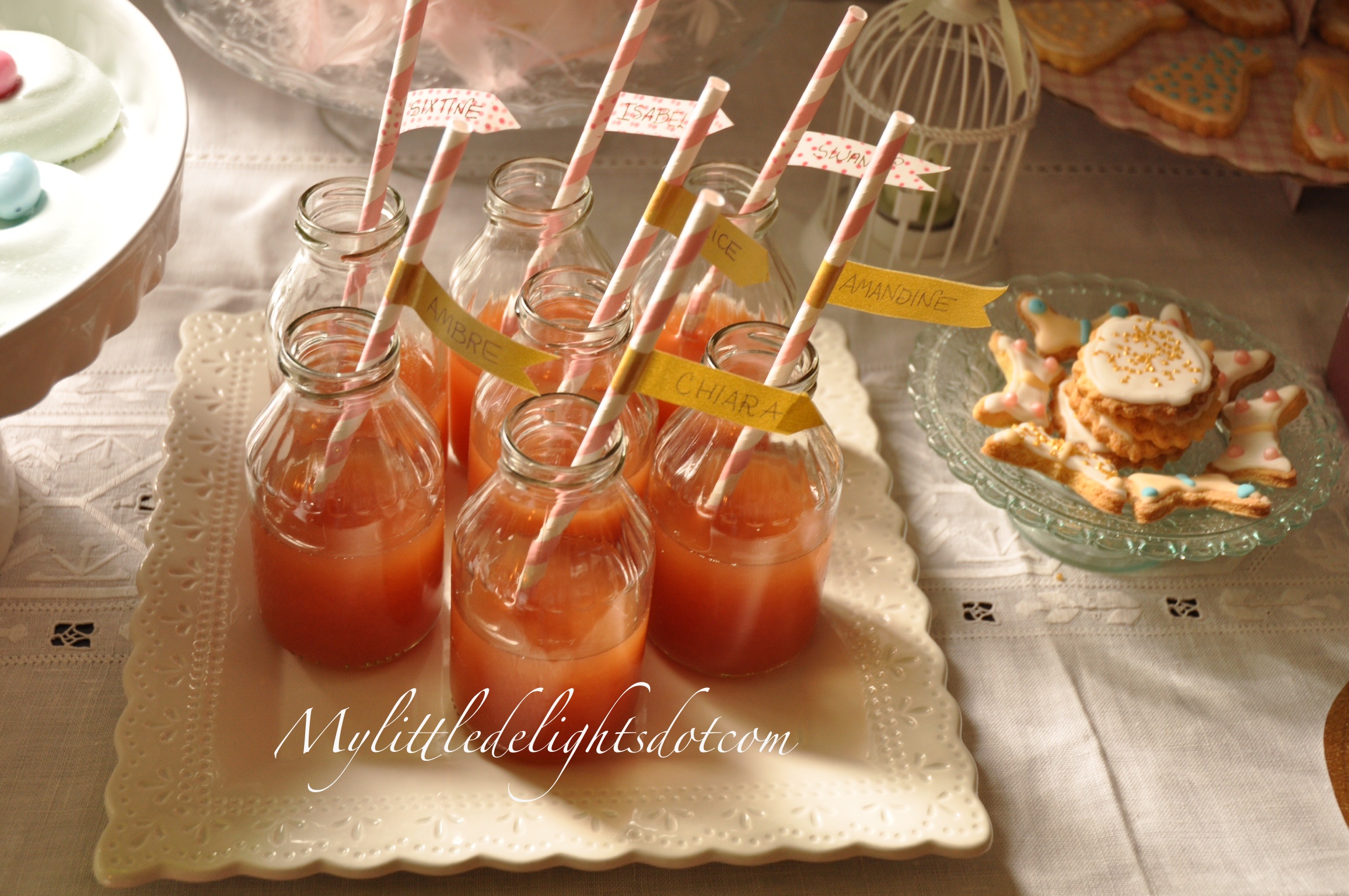 1. Merci! Ce sont des petites bouteilles de jus pour bébé Nestlé. ça coûte très peu comparé aux bouteilles à lait pour les fêtes, il y a un bouchon, et en plus le jus est bon…
