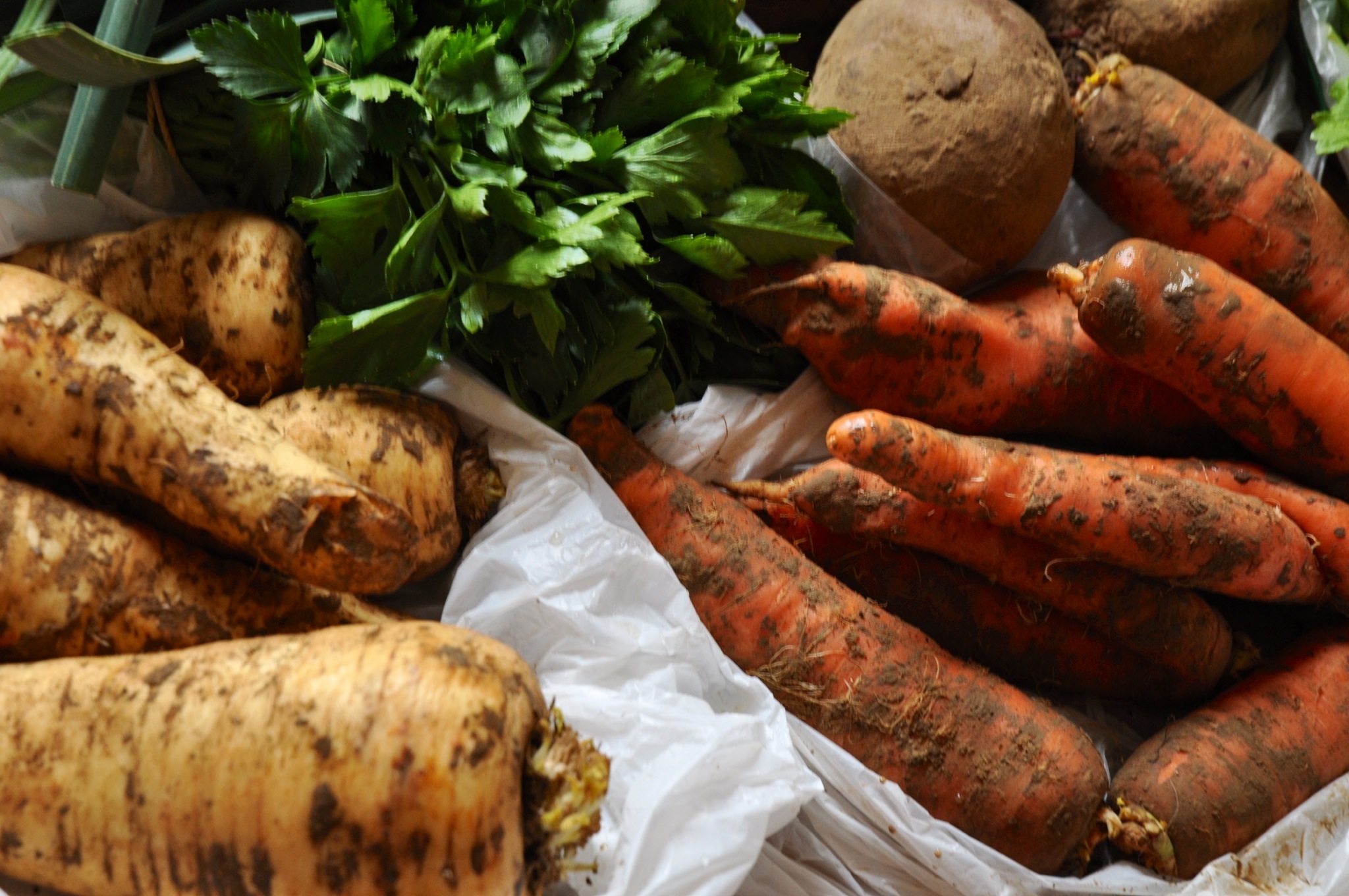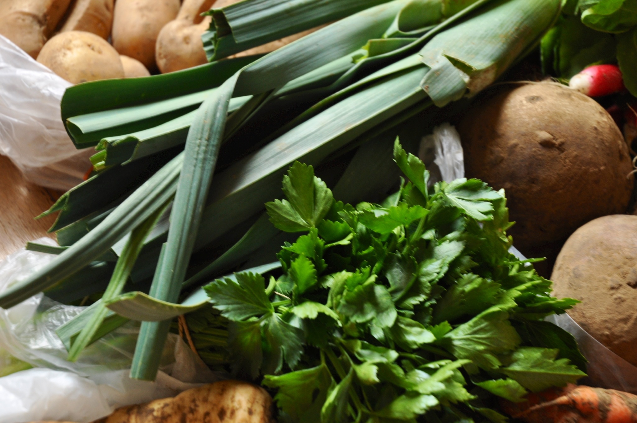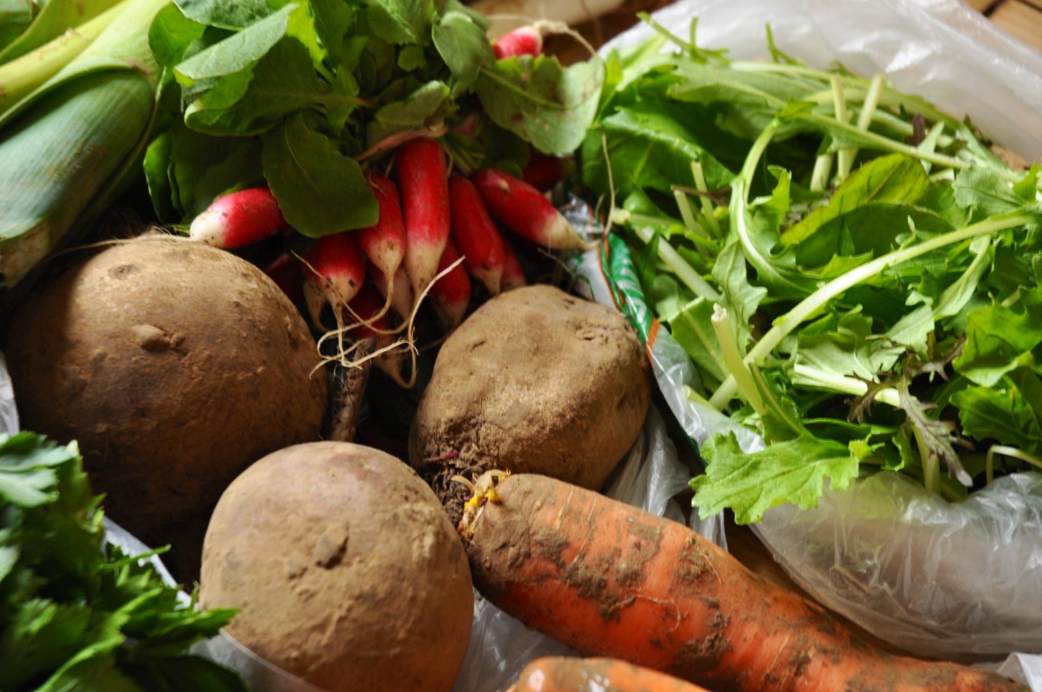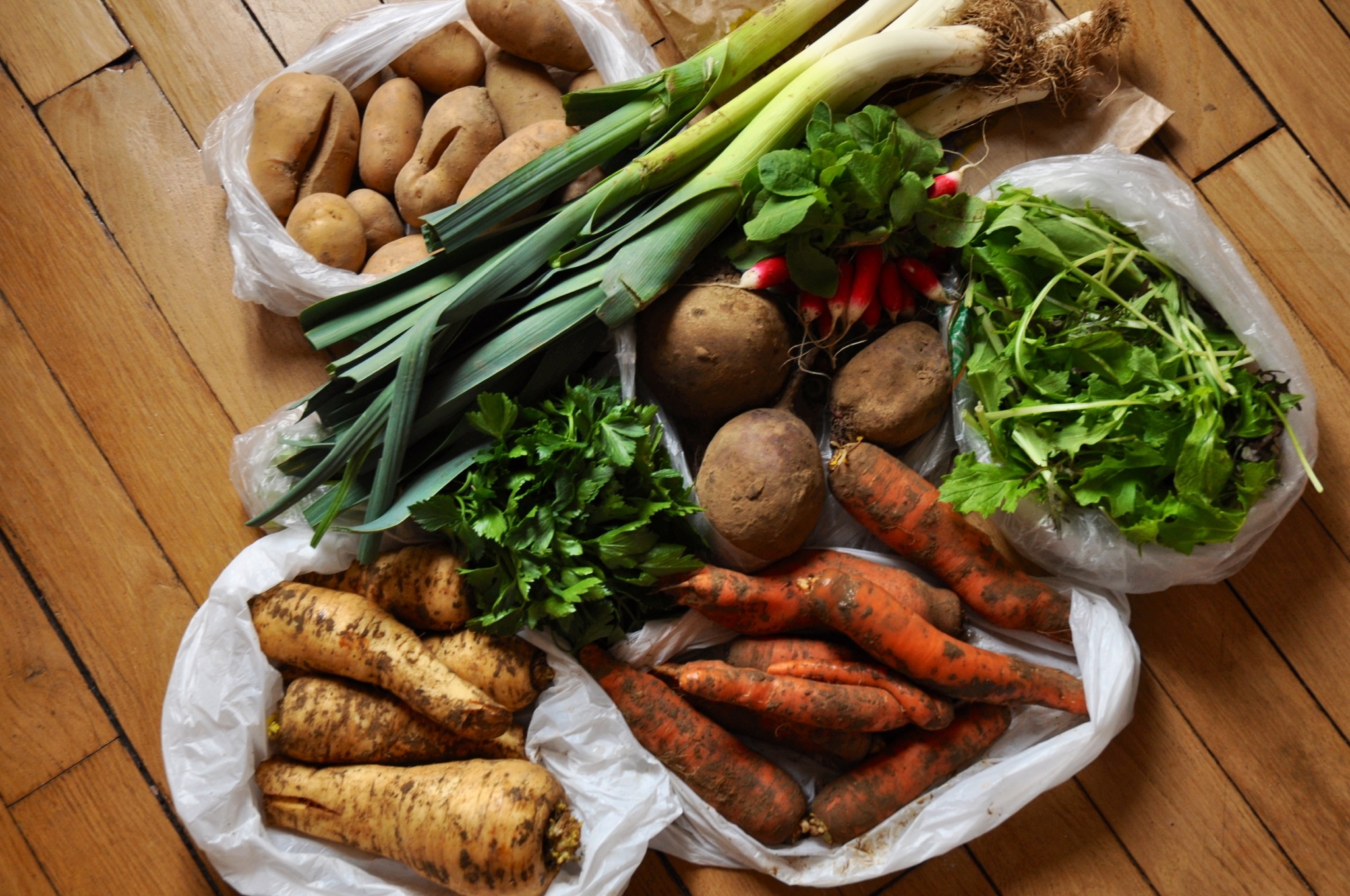 The basket was loaded with: carotts, potatoes, parsnip, horseradish, salad, chervil, leek and pink radish.
