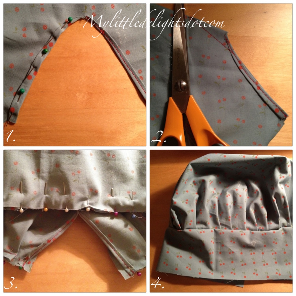 Pic 1: If, like me, you want your hat to be adjustable, you have to cut a triangle off the future back of the upper part so that your fabric won’t bulk up. Mine measures 8 cm x 10 cm (but you can make it larger, once finished I saw there is still a bit too much fabric when it’s tightly closed). I’ve doubled the sides of the triangle and sewn into place. Pic 2: I’ve sewn the fabric, right sides together, toward the centre (you have room to go further than me). Pic 3: I’ve pinned the upper part on the fabric strip, being careful to gather it evenly and leaving a small sewing allowance on the sides. Pic 4: and here we are once it’s done.