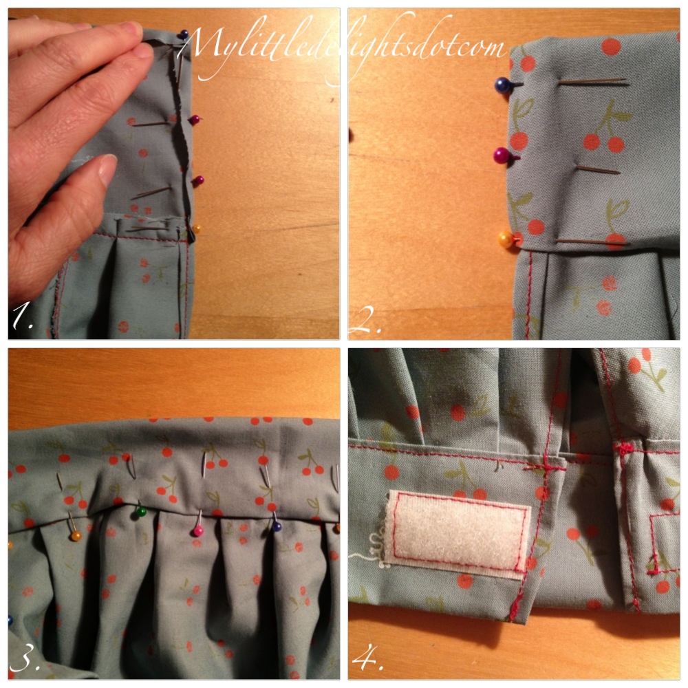 Photo 1: Retournez le tissu aux extrémités et en haut selon votre marge de couture, épinglez tout le long. Photo 2: repliez le tissu à moitié, épinglez bien sur les extrémités retournées. Photo 3: épinglez tout autour en couvrant la couture de tout à l’heure et piquez au raz du bord. Photo 4: Il ne vous reste qu’à coudre vos scratch d’un côté et de l’autre de la bande de tissu.
