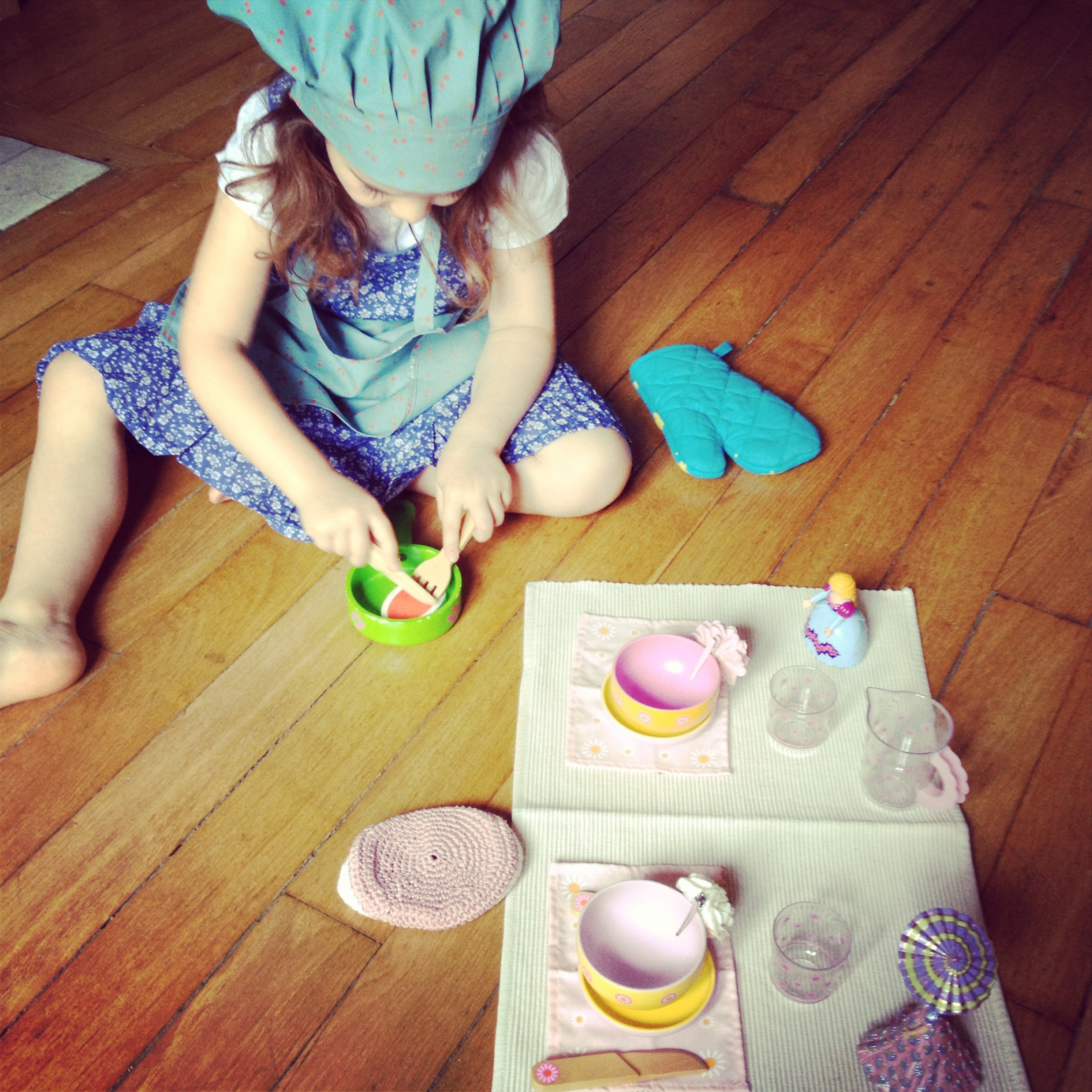 Yesterday was a simple day, made of simple pleasures. Getting up without alarms, having breakfast while chatting away, quietly observing Chiara make up stories with her toys, enjoying a good meal she prepared for me then baking some on-demand cupcakes together (apple/chocolatechips/pistaches/and vanilla..ha), waiting for them to cool down while sewing up a tote bag for her. Cuddling a lot and saying I-love-yous (and the cat too).