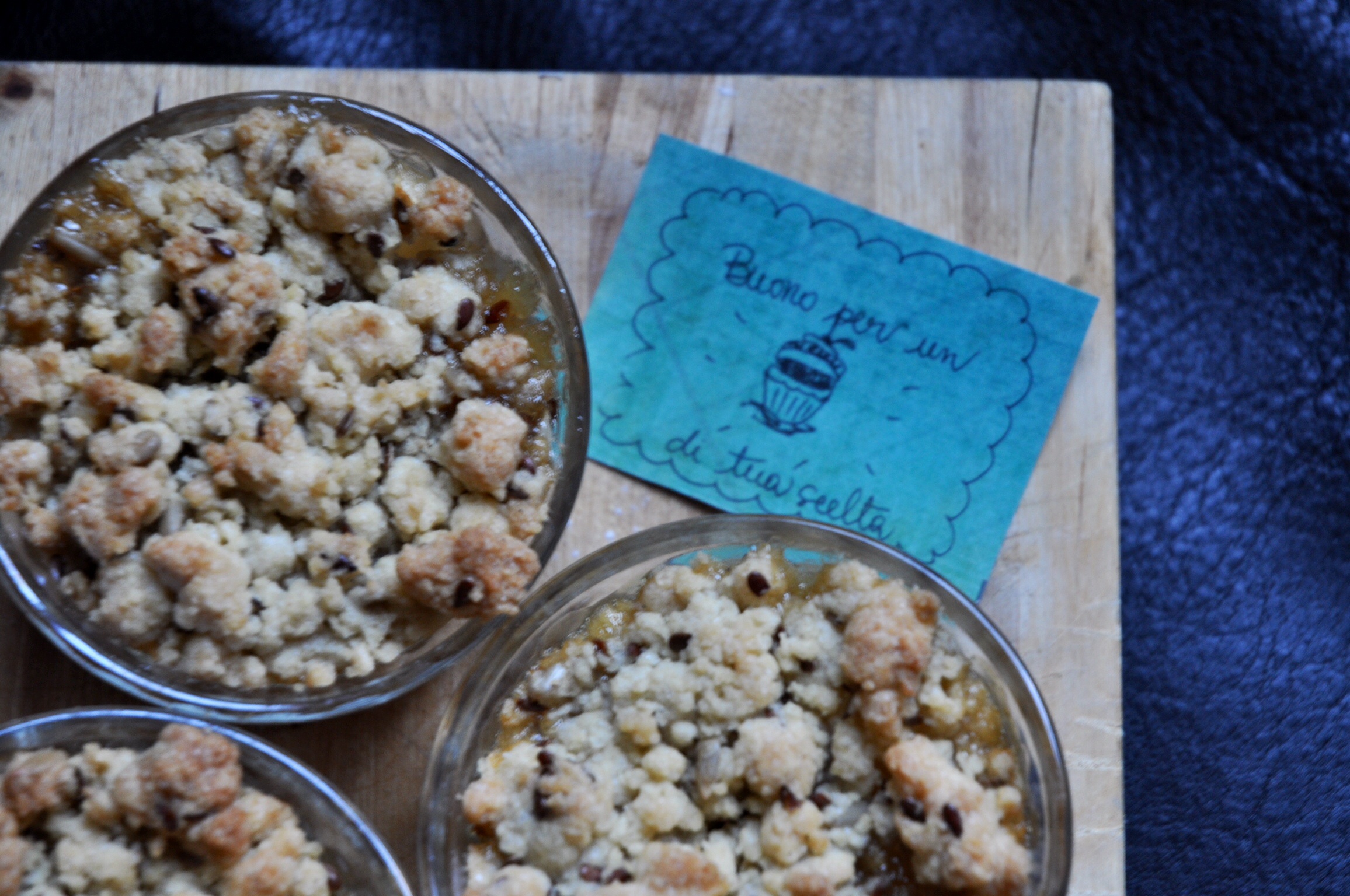 Gabriele a choisi un brownie, son dessert préféré dans l’absolu, je crois, (hélas je n’ai pas eu le temps de le prendre en photo); Chiara, un crumble aux pommes, comme on en avait cuisiné ensemble peu de temps auparavant, avec les bonnes pommes de l’AMAP. J’avoue avoir un petit faible pour ce dessert en automne/hiver; les fruits tendres, les miettes croustillantes…uhmmm…avec un bon thé,c’est un vrai régal. La bonne nouvelle pour ceux et celles qui ne doivent (ou ne veulent pas) manger de laitages et/ou du gluten est qu’on peut s’en passer sans problèmes; pas belle la vie?